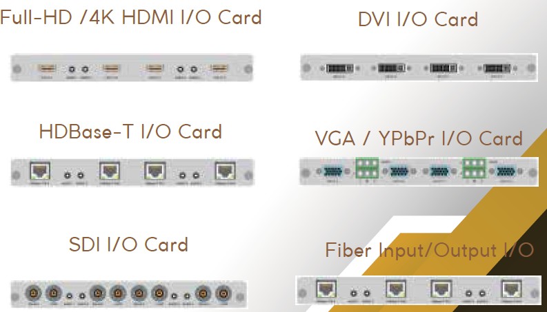 - Hỗ trợ đa dạng chuẩn kết nối: HDMI, DVI, VGA, SDI, HDBaseT và Fiber Optic.